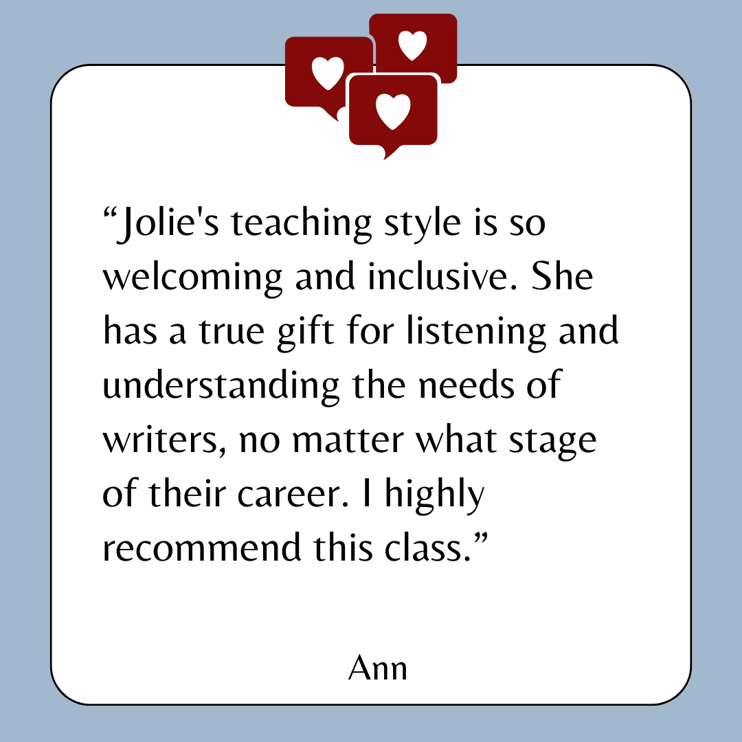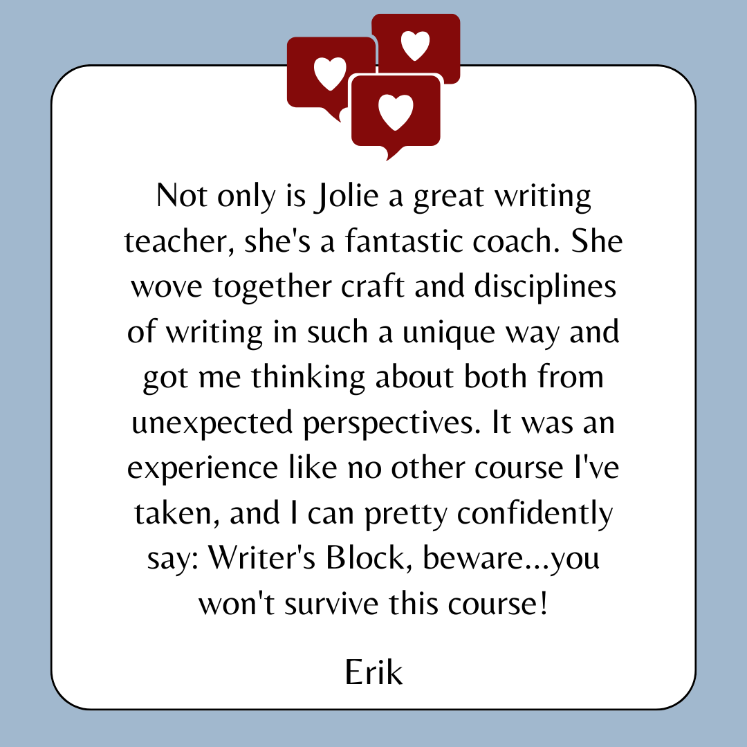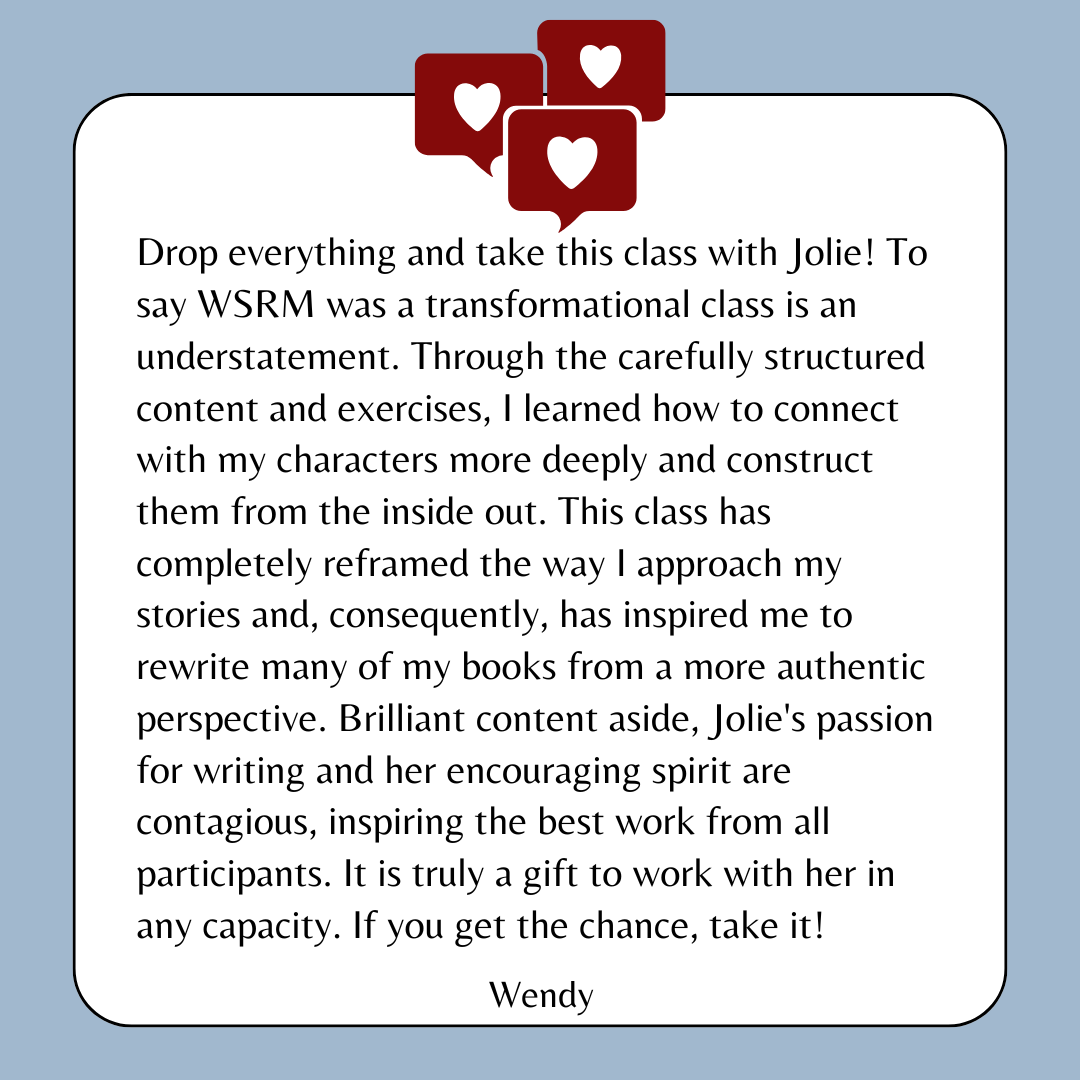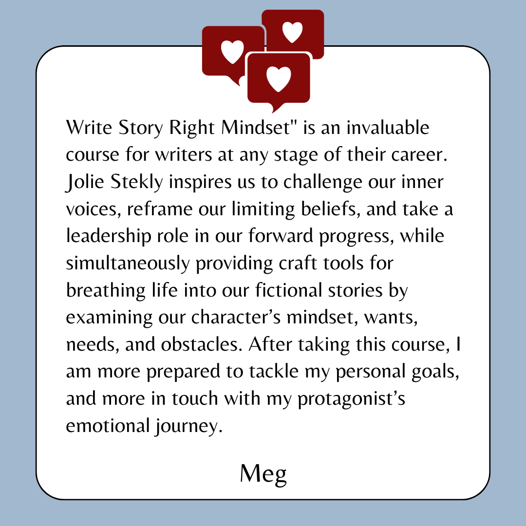 I truly believe it will, if you commit, not just to the course, but to yourself. Whether you are stuck with process, mindset, and/or story, we will be taking a look in one way or another. But this course is designed to take you inward, finding your unique issues, as well as solutions, whether that’s overcoming writer’s block, or gaining clarity on a character’s arc.